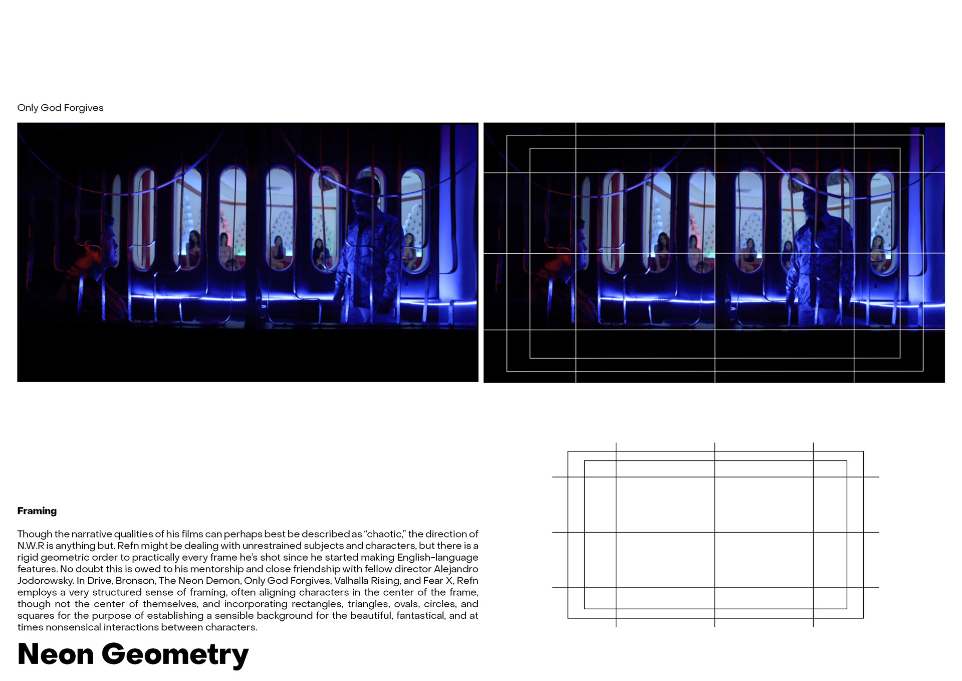 Filmic Architecture was a module during my 1st year of masters at Manchester School of Architecture, studying the role of architecture in films. We were tasked with studying the work of a director of our choice. In this case, Nicolas Winding Refn.